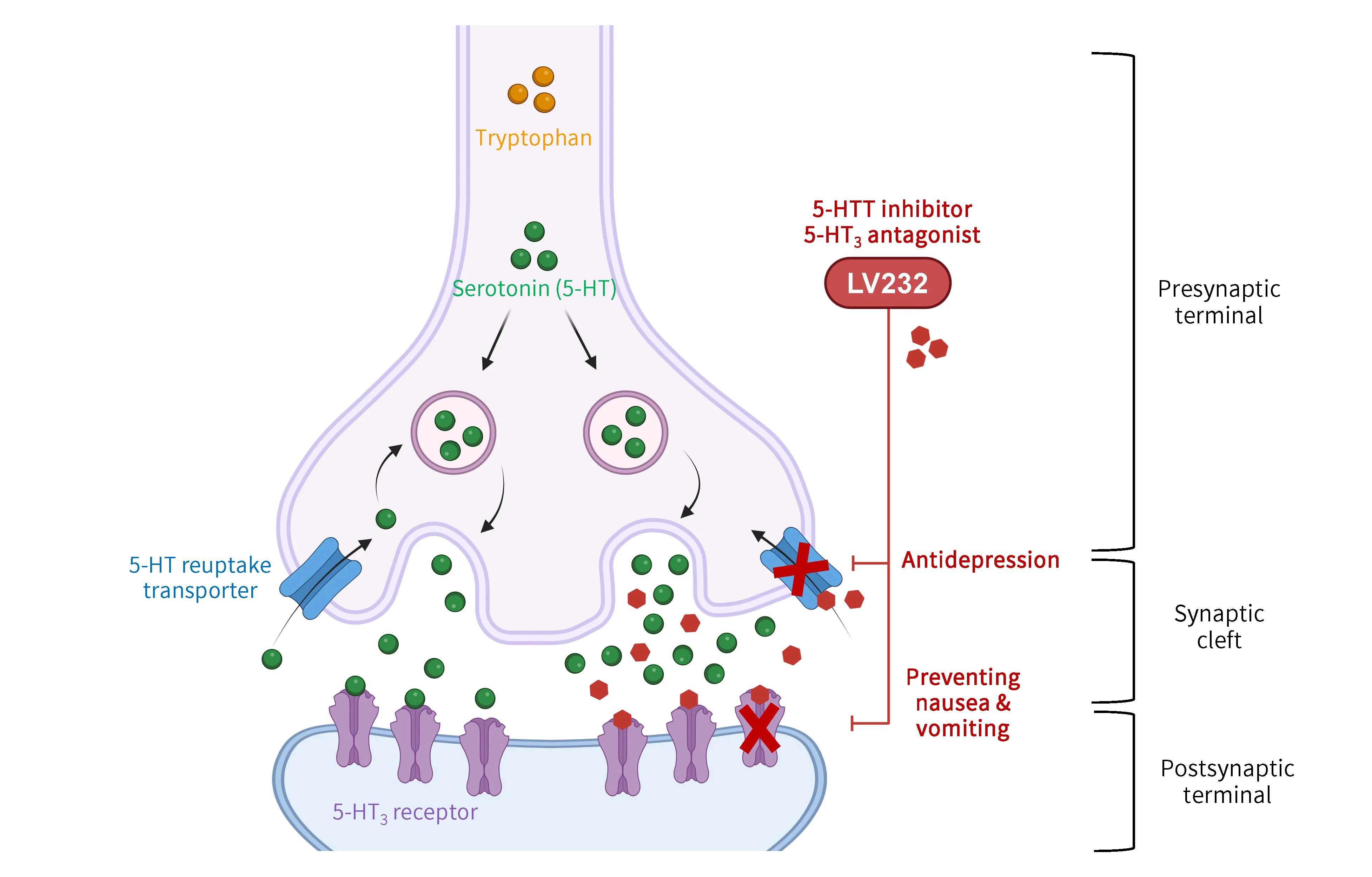 LV232 is a novel investigational antidepressant that acts as a dual modulator of both the serotonin transporter (5-HTT) and the 5-HT3 receptor. It is currently in Phase II study. Research indicates that inhibition of 5-HTT increases serotonin concentration in the synaptic cleft, thereby alleviating depressive symptoms. Antagonism of the 5-HT3 receptor not only mitigates adverse effects such as nausea and vomiting—which are commonly associated with 5-HTT inhibition—but also elevates levels of norepinephrine and acetylcholine in the brain, contributing to improved emotional and cognitive symptoms. Compared to marketed selective serotonin reuptake inhibitor (SSRI) antidepressants, LV232 is anticipated to demonstrate a more favorable gastrointestinal tolerability profile and potentially better patient compliance in clinical practice.