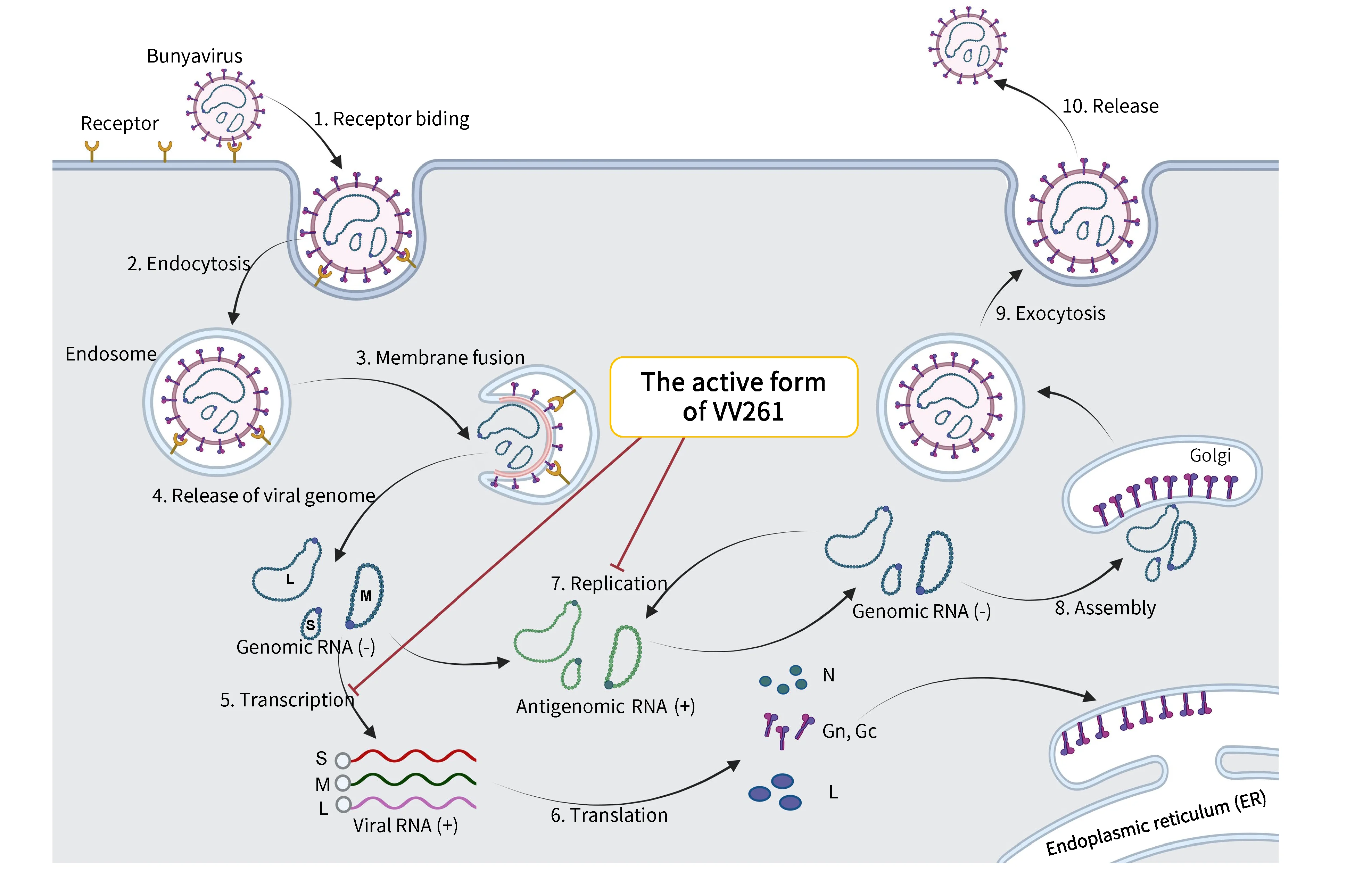 VV261 is a novel nucleoside double prodrug with broad-spectrum antiviral potential. It has demonstrated inhibitory activity against a variety of RNA viruses, including bunyaviruses, chikungunya virus, SARS-CoV-2, influenza viruses, and arenaviruses. Currently, VV261 is being clinically developed for the treatment of Severe Fever with Thrombocytopenia Syndrome (SFTS) caused by the novel bunyavirus (SFTSV) infection and is in Phase I study. Preclinical studies indicate that VV261 potently inhibits SFTSV, with its inhibitory potency surpassing that of the positive control drug, favipiravir. In an SFTSV-infected Ifnar1 gene knockout mouse model, VV261 effectively suppressed viral replication in multiple tissues (including spleen, liver, heart, lungs, and kidneys), ameliorated virus-induced hematological abnormalities and splenic pathology, and exhibited a clear dose-response relationship. Notably, 100% survival was achieved in the mid- and high-dose groups, whereas all animals in the model control group succumbed.